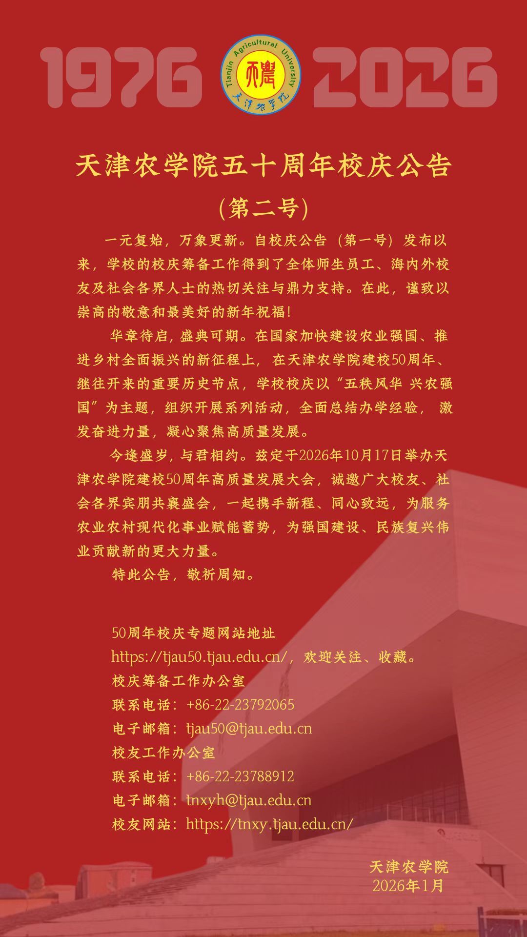 天津农学院五十周年校庆公告(第二号)